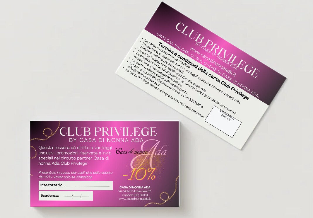 Il Club Privilege è un network esclusivo di partner locali selezionati creato da Casa di nonna Ada per offrire ai clienti vantaggi e promozioni dedicate. L’obiettivo del Club è creare un circuito ristretto di collaborazioni tra attività locali di qualità, aumentando la visibilità reciproca e incentivando la fidelizzazione dei clienti.