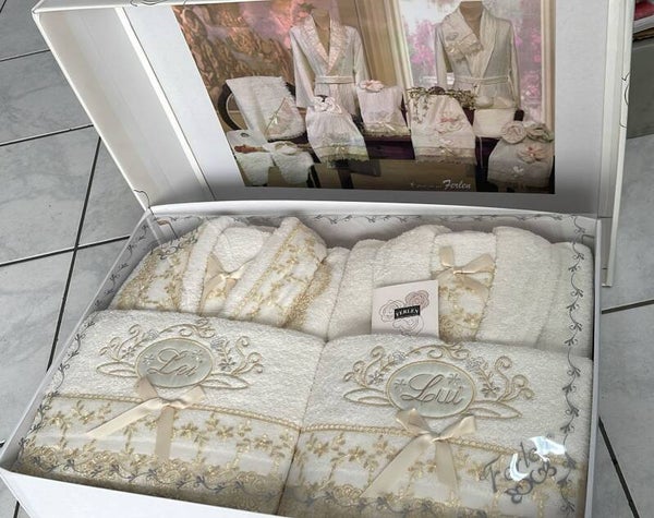 Completo bagno 8 pezzi in spugna tinta unita con ricamo e pizzo