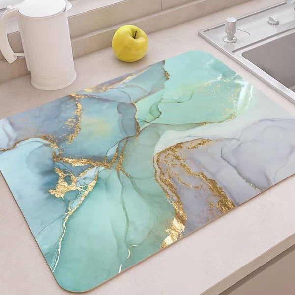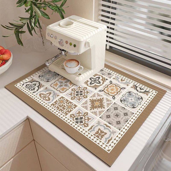Il tappetino 40x50 cm è assorbente, antiscivolo e ad asciugatura rapida, perfetto sotto la macchina del caffè o come base per il piano cucina.