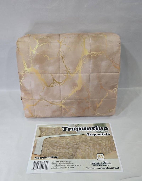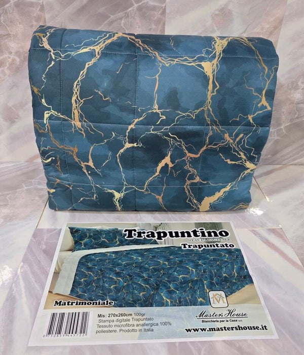 Dona uno stile moderno e raffinato alla tua camera con il trapuntino matrimoniale Master’s House, realizzato in microfibra anallergica con stampa digitale effetto marmorizzato. Leggero e versatile, è perfetto per le mezze stagioni o per chi ama dormire con una copertura morbida e leggera tutto l’anno.