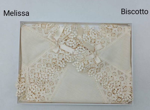 Dona un tocco raffinato e senza tempo alla tua tavola con il Tris Centri Tavola Melissa, realizzato in puro cotone jacquard con elegante effetto zebrato tono su tono. I delicati bordi in pizzo con fiocchi in raso rendono questo set perfetto per ambienti eleganti, regali speciali o per chi ama curare ogni dettaglio della casa.