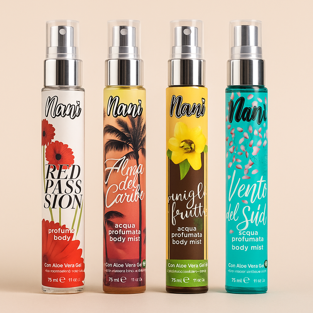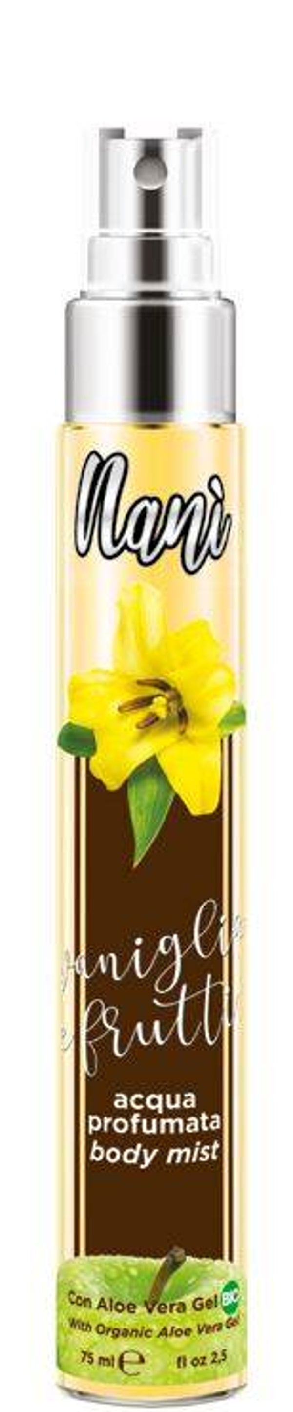 Acqua profumata Nani 75 ml in varie fragranze. Fresca e delicata, arricchita con Aloe Vera bio. Ideale per corpo e capelli, uso quotidiano.