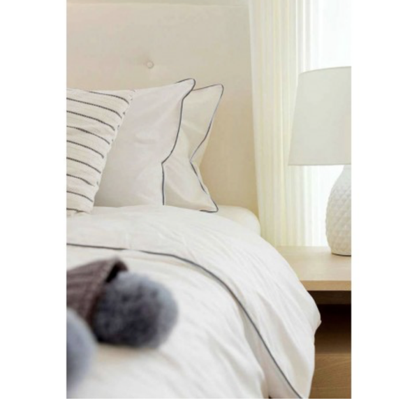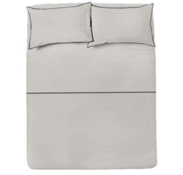 Completo letto 100% cotone Bordo a Contrasto. Disponibile nella misura matrimoniale in più colori. Bordatura a coda di topo (piping) sia sulle federe sia sul lenzuolo di sopra.