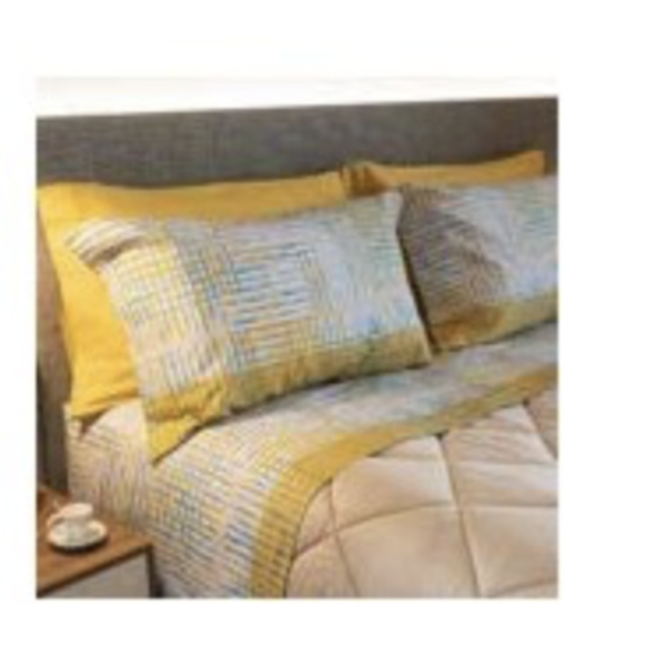 - 2 Piazze: Lenzuolo sotto con angoli 175x200 + angolo elasticizzato; lenzuolo piano 250x290 cm; 2 federe 52x82 cm con due volani.